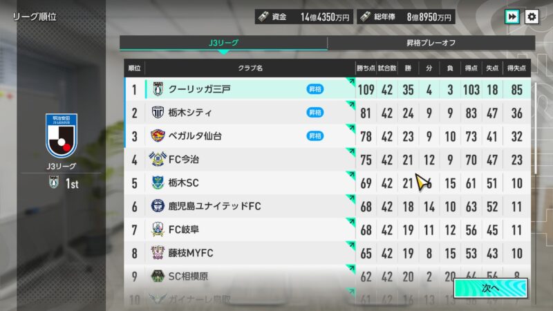 勝ち点109(勝35、分4、負3、得点103、失点18、得失点85)で、J3優勝という文句無しの成績で・・・