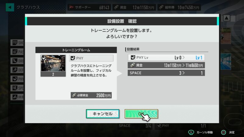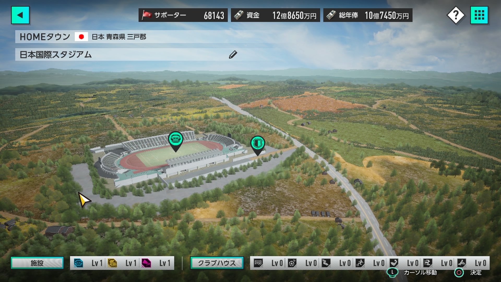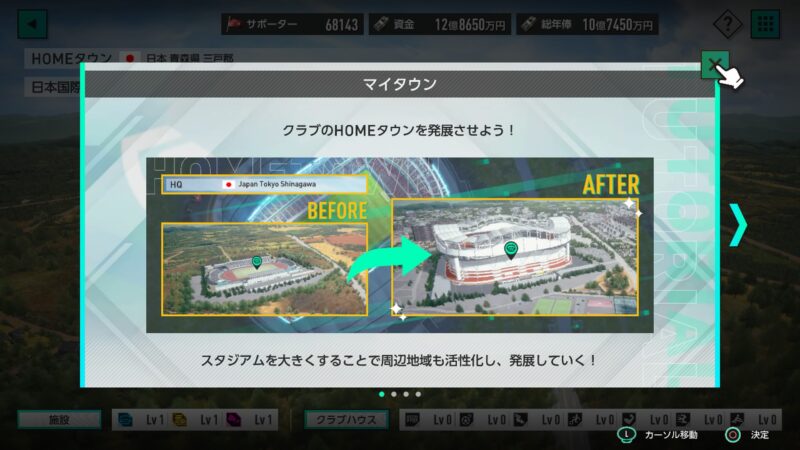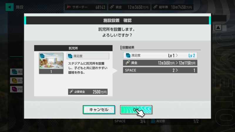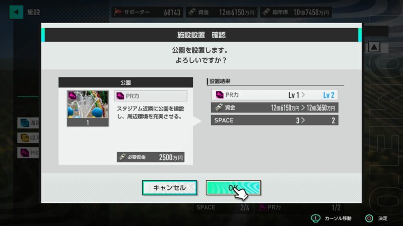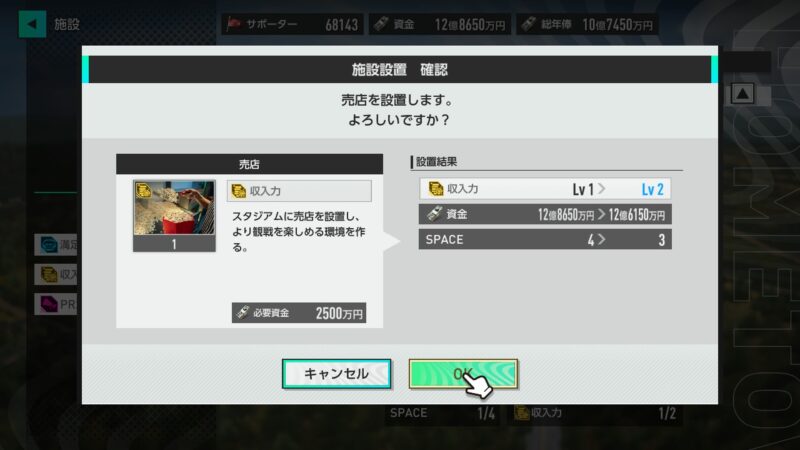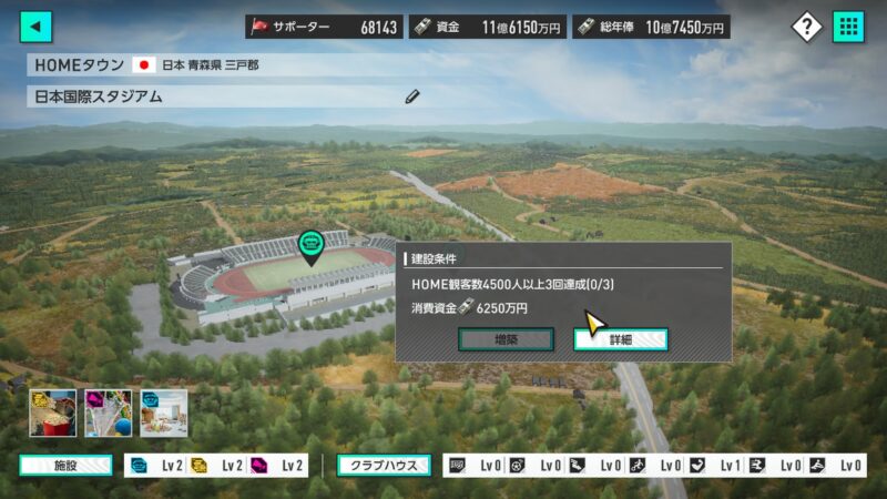 資金に多少の余裕もあることだし、スタジアムやスタジアム周りの施設を設置してみます!