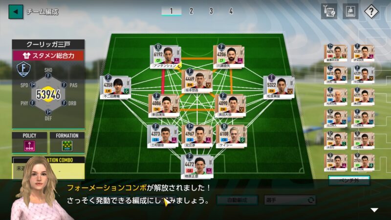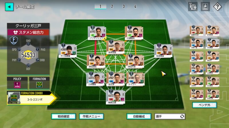 「3ー5ー2コンボ」をセットしてみました!(ちょっとですが、「スタメン総合力」が上がったみたい♪)