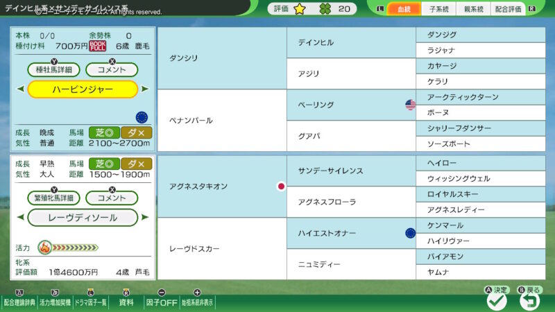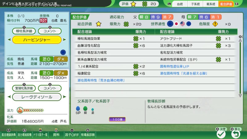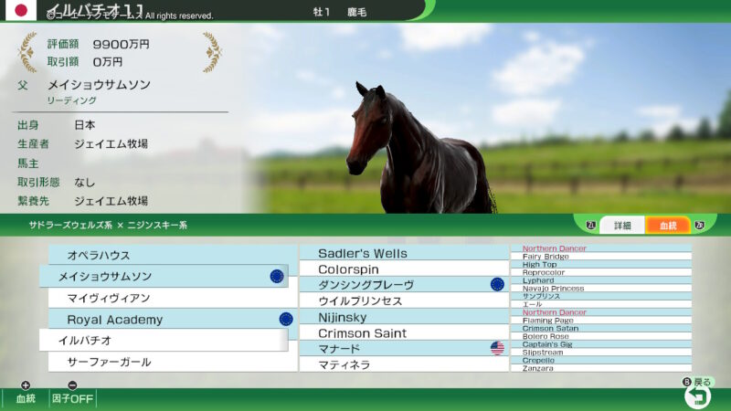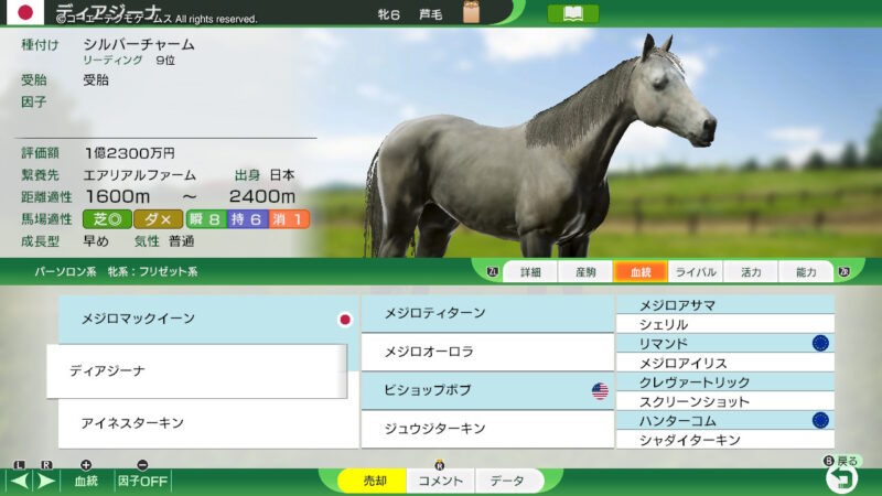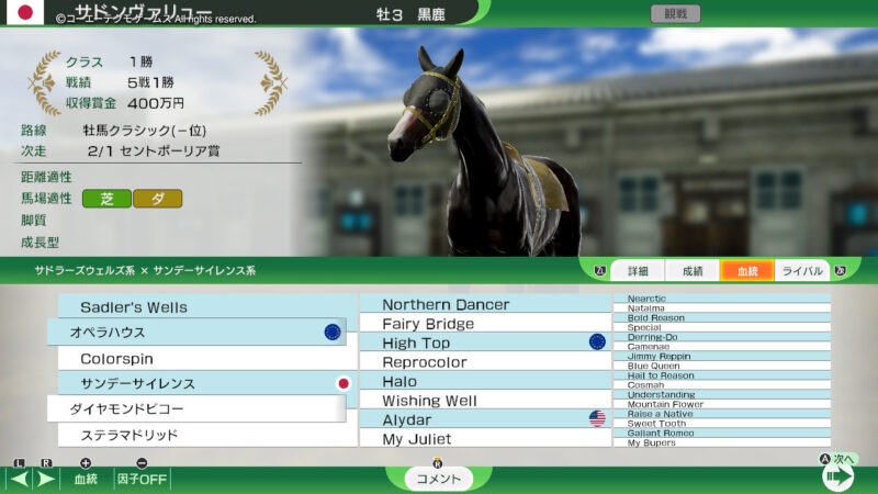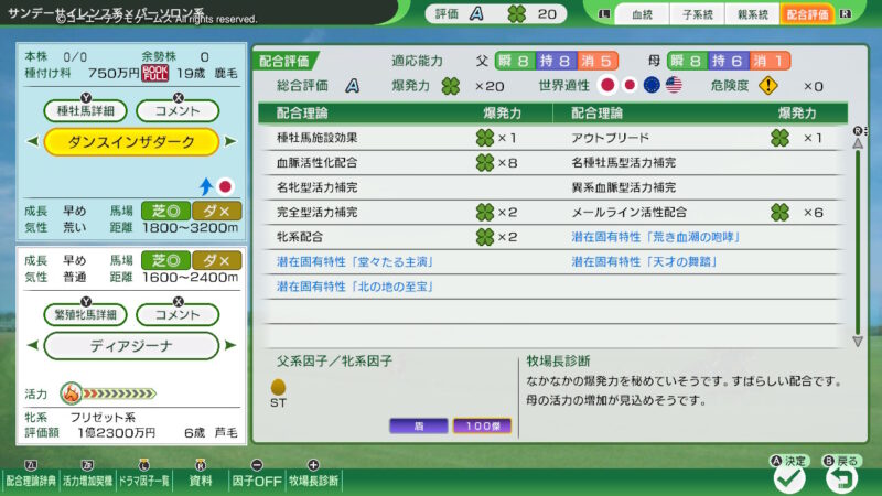 「ディアジーナ」には「ダンスインザダーク」を種付け!(血統表のスクショが撮れていなかった・・・どうも、まだスイッチでのWPのプレイには慣れない・・・)