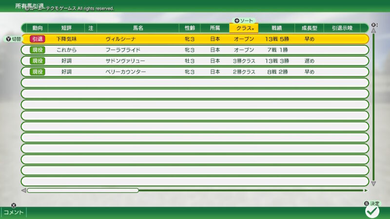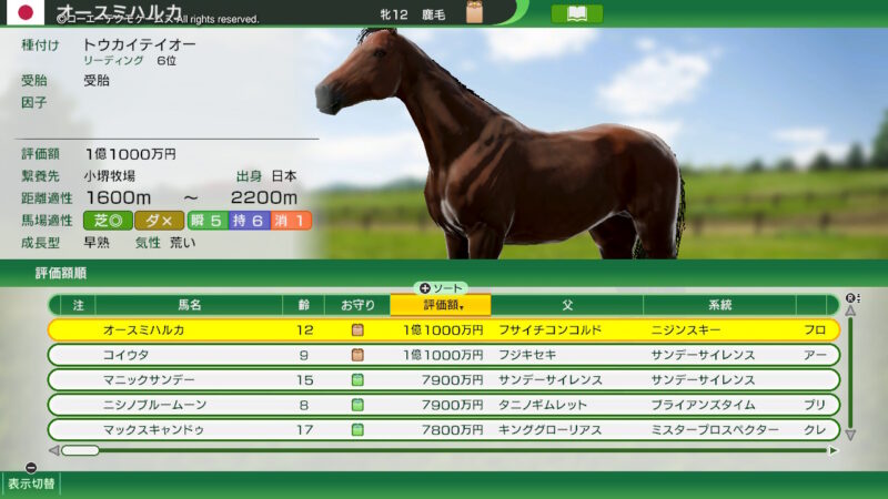 ショックなことに「ヴィルシーナ」が下降気味になってしまったので引退させることになってしまったのですが・・・(下降気味になったら引退させる方針なので!)