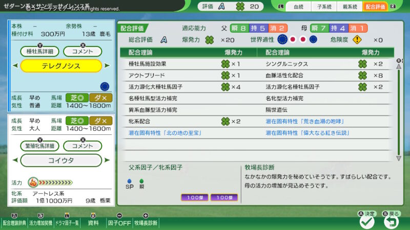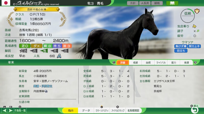 なるべく良い繁殖牝馬を揃えたいので、引退後のことを考えて「ベリーカウンター」を選択!